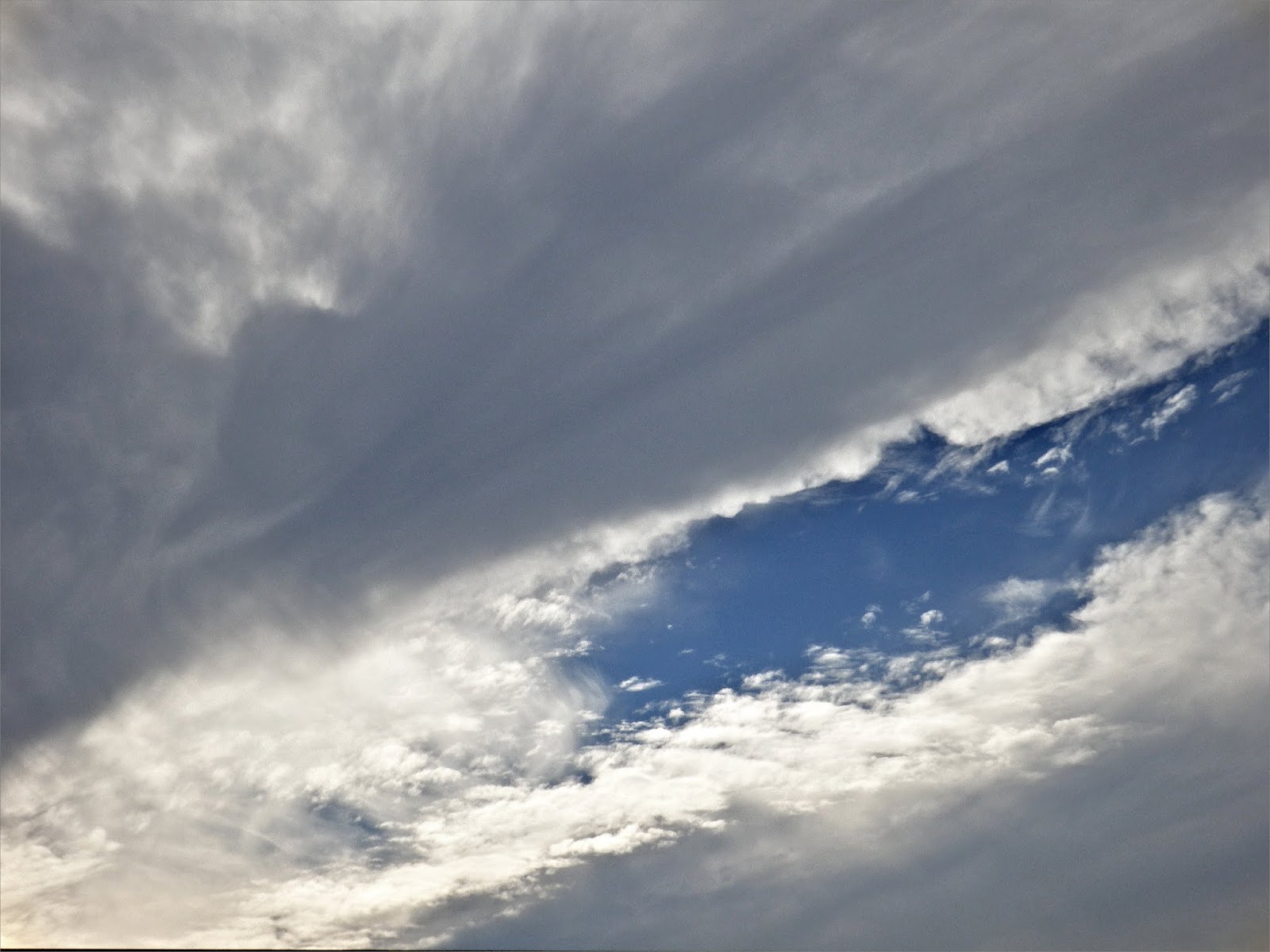 Entre linhas em V, as nuvens levantam o sol e o envolvem. Por baixo delas, à direita, a folhagem em contraste nos fala das raízes e da busca em verde tentando tocar para além dos fios